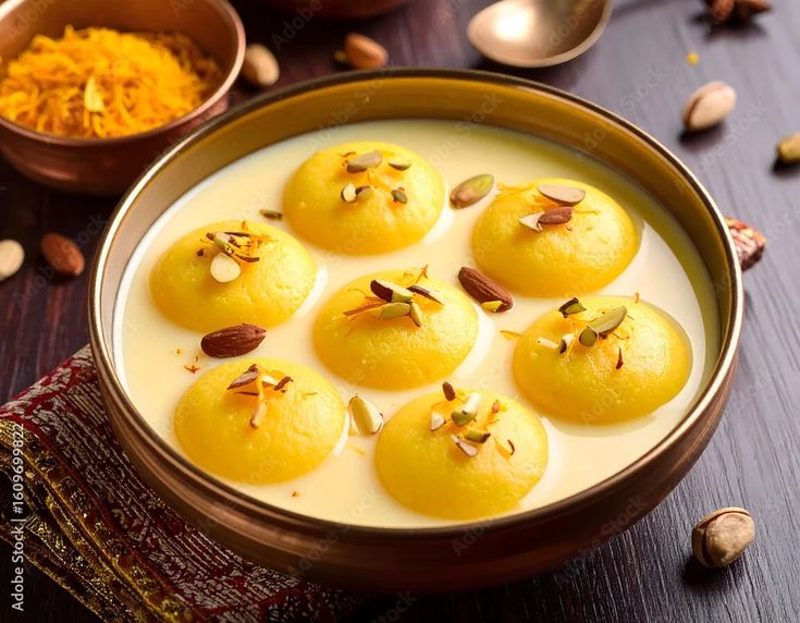 Delicate cottage cheese patties soaked in sweet saffron milk.
