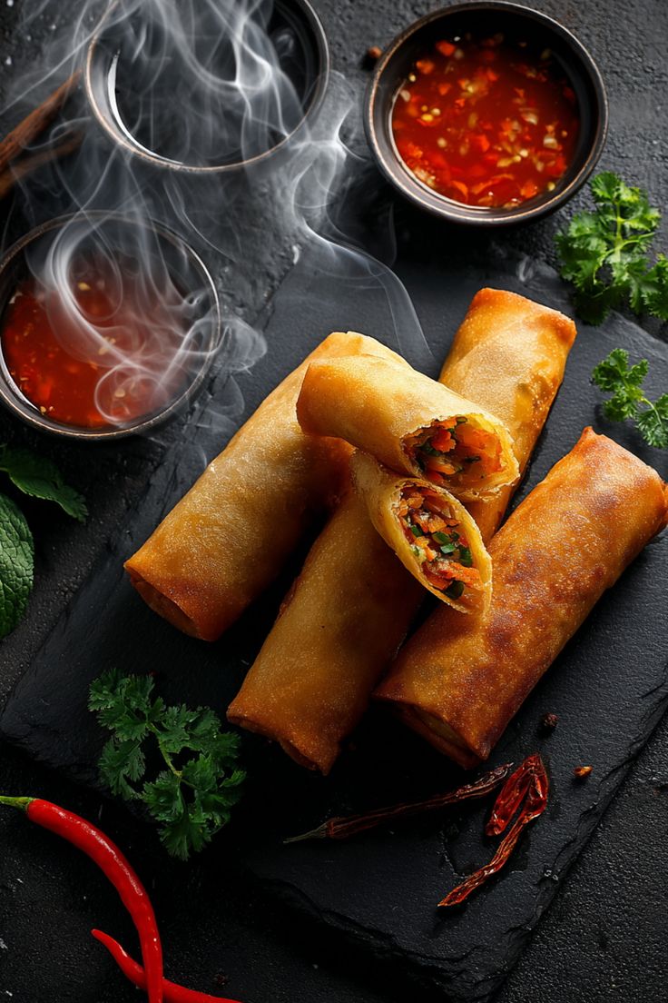Crispy rolls stuffed with seasoned vegetables and herbs.
