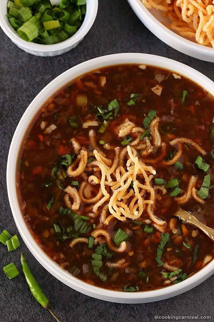 Spicy Indo-Chinese soup loaded with vegetables and crispy noodles.